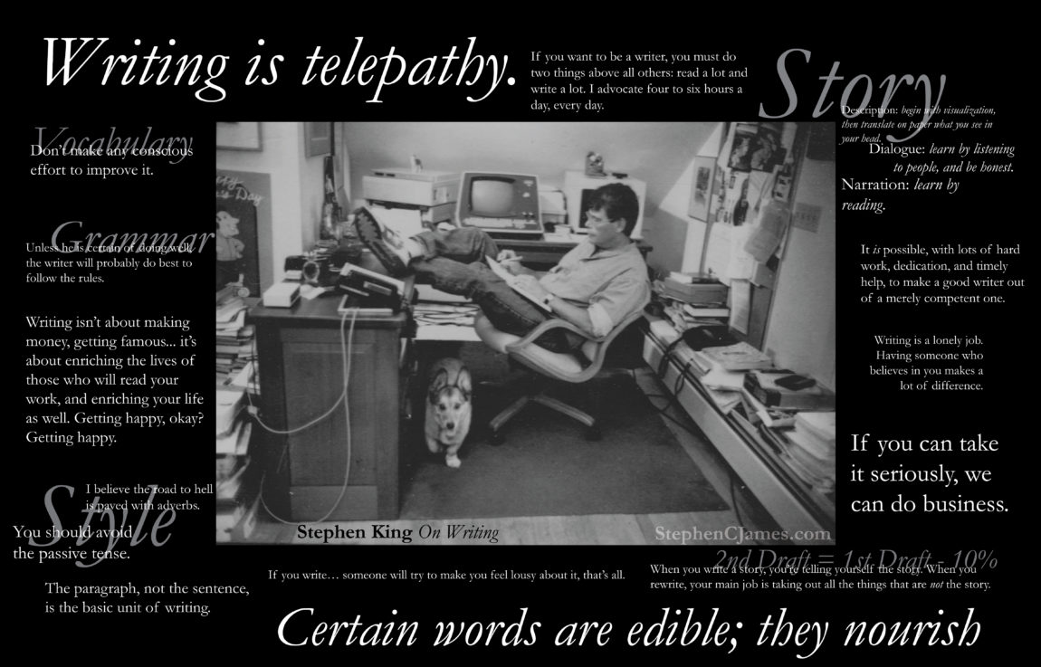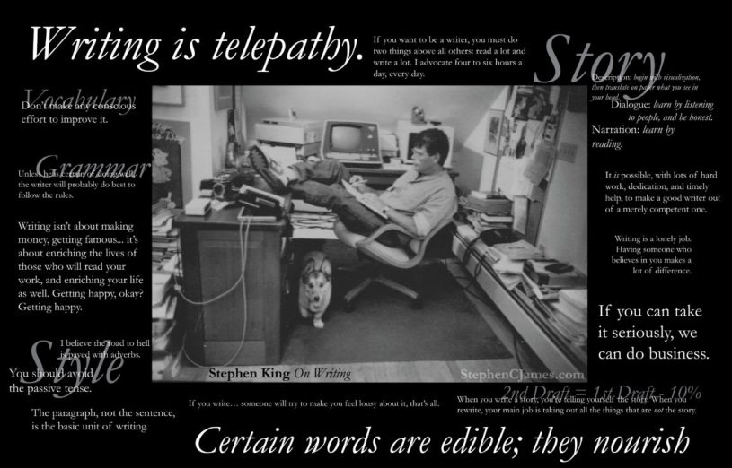 I’ve been reading Stephen King’s “On Writing,” a part memoir, part master class that essentially offers the tools an aspiring author needs to quit aspiring. Stephen offers advice while dissecting memories from his childhood and his early career as a writer. He talks about his near-fatal accident, and how writing helped him heal–but more importantly, he does something a lot of professors of writing and even renowned craft books like The Elements of Style fail to do.